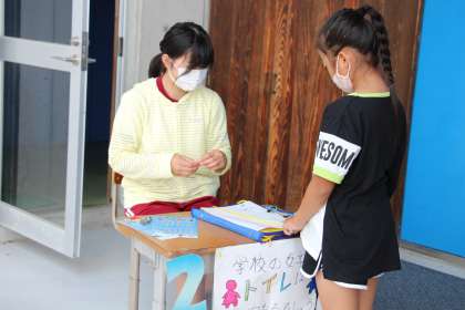 石畳王決定戦 公開日 2021/06/21 更新日 2021/06/21 お知らせ 代表委員の企画による「石畳王決定戦」が、本日よりスタートしました。石畳小にまつわる問題がいろいろな場所で出されます。それを解いて代表委員に見せ、正解だとシールをもらえるという企画です。誰が一番多くのシールを集め、「石畳王」になるのか楽しみです。