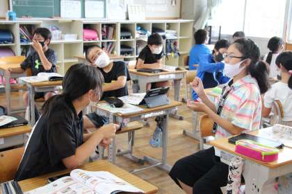 今日の様子 公開日 2021/06/25 更新日 2021/06/25 お知らせ 3年生の社会の授業です。今日は特別に担任ではない先生に教えてもらいました。地図帳の見方をていねいに教えてもらいました。 6年生の家庭科では、ペアで役割演技をしている場面です。緊急事態宣言も解除され、調理実習に向けて学習をスタートしています。