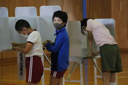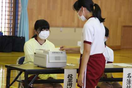 本日、豊田市選挙管理委員の方を講師にお招きし、出前選挙授業が行われました。実際に使う機材そのままで、児童が役割も分担し、本番と同じように選挙の模擬体験を行いました。