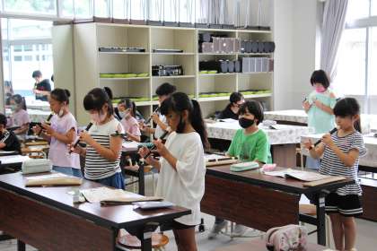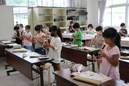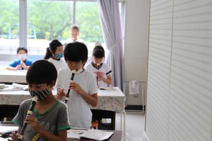 音楽のリコーダーの授業です。コロナが収束していないため、隣の子と同時に演奏しないように、順番に演奏しました。