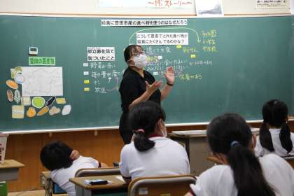 「給食で豊田市産のものが多く出るのはなぜだろうか」という問いに、みんなで考えを出し合い、その秘密を栄養士さんに教えていただきました。
