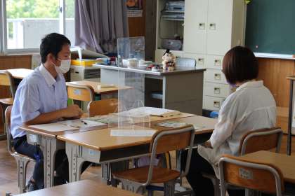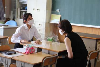 4〜6年生の懇談会の様子です。コロナ禍ですので、透明の仕切り板を置いて行っています。