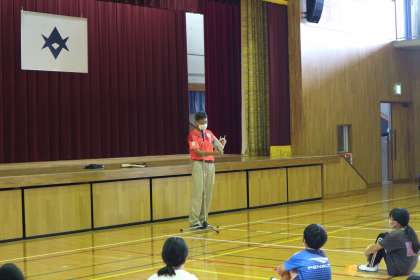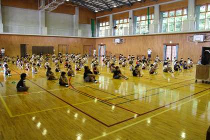 9月初めの全校集会を行いました。転入生の紹介もあったため、リモートではなく体育館にて行いました。感染対策のため、いつも以上に前後左右の間隔をとり、体育館全体を使って行いました。