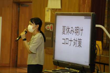 次に養護教諭から、改めて「9月からのコロナ対策」の話をしました。デルタ株の流行で家庭内での感染が多くなっています。学校での感染が無いように努めます。学校からの配付文書もありますので、ご確認ください。