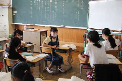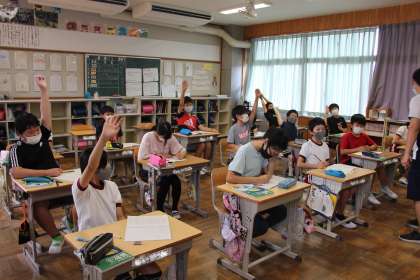 5年生は、ペアでの話し合いの場面です。距離をとって意見交換をしています。6年生は、問題ができたら挙手の場面です。少しの手だてで意欲化が図れていました。