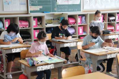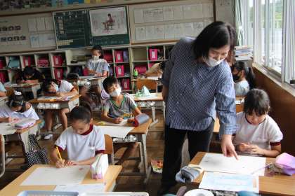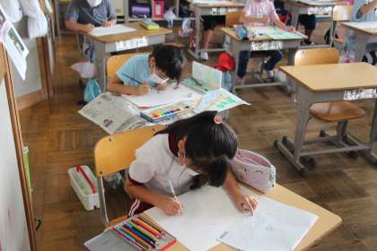3年生の図工は、「エコメッセージカードを作ろう」でした。自然やリサイクルなど、各自が考えた題材をもとに、作品作りに取り組みました。