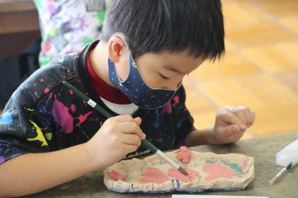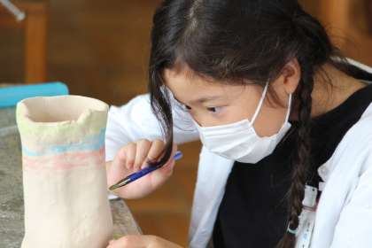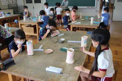陶芸活動1 公開日 2021/09/15 更新日 2021/09/15 お知らせ 各自が作っている陶芸作品ですが、素焼きが終わったあとは、絵付け、撥水剤ぬり、釉薬ぬり、本焼きという過程で進めます。 今日は、1年生と他学年の欠席者、未完成者の絵付けと、6年生は撥水剤ぬりを行っていました。とてもいい目をして活動していました。