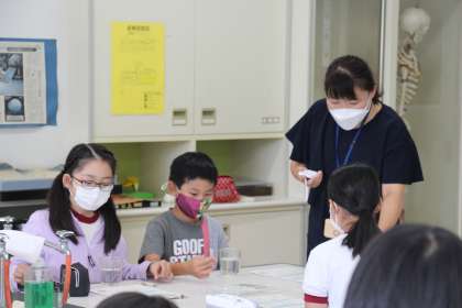 本日は、市役所環境保全課の方にご協力いただき、出前授業を行ってもらいました。先日の白川での生き物調査を踏まえ、白川と水道水との水質の違い等、学習しました。