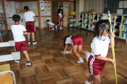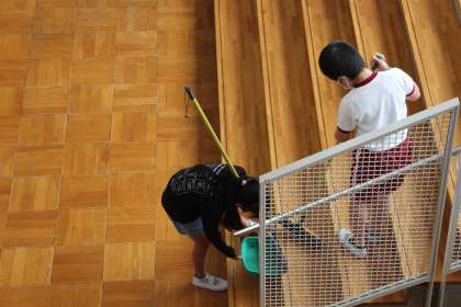 清掃活動の様子です。全校児童120名に対し、広すぎる校舎や敷地をどのようにきれいにするかが問題です。子どもたちの知恵と働きに期待するしかありません。