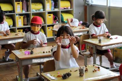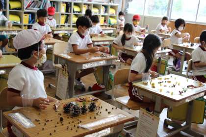 1年生の図工の様子です。秋の物を集めて「ならべてならべて」の作品づくりを行いました。