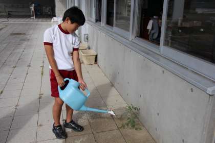 くすのき学級の南側テラスに、「ど根性ミニトマト」があります。畑のミニトマトと共に、水やりをして育てています。