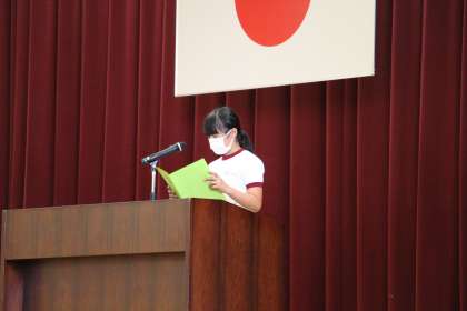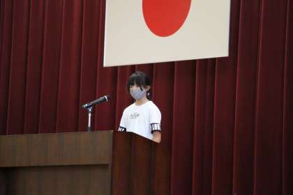 学期区切り式 公開日 2021/10/11 更新日 2021/10/11 お知らせ 本日は、令和3年度前期最終日となります。そこで、5時間目に「学期区切り式」を行いました。 代表児童の意見発表の様子です。前期の振り返りをもとに、がんばったことと、後期にがんばりたいことを堂々と発表しました。とても素晴らしい発表だったので、その後に話す私には、とてもプレッシャーになりました。