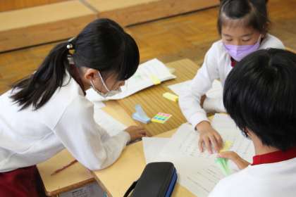 3年生国語研究授業2 公開日 2021/10/19 更新日 2021/10/19 お知らせ 授業では、子どもたちが付箋やシールを使って、友だちの文をよりよいものになるようアドバイスするという内容でした。 反応のよさや意味のあるつぶやき、素直さ、温かさ等、今回の授業はもちろん、普段からの生活態度が反映されたすばらしい授業だとほめていただきました。もう、高学年としての気持ちが高まってきたようです。 児童下校後、私たち全職員が参加のもと研究協議会を行い、学びを深めました。