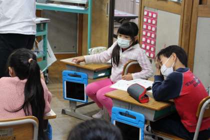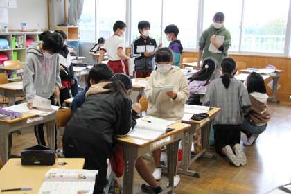 算数の授業 公開日 2021/10/25 更新日 2021/10/25 お知らせ 3年生の算数です。「のんびり」と「スピード」の二つの方法から選んで、計算していました。最終的には「はかせ:早く、かんたんに、正確に」となるのですが、今しっかりやり方を理解することが大切です。 5年生は、帯分数の計算と闘っていました。グループで教え合いながら理解を深めました。