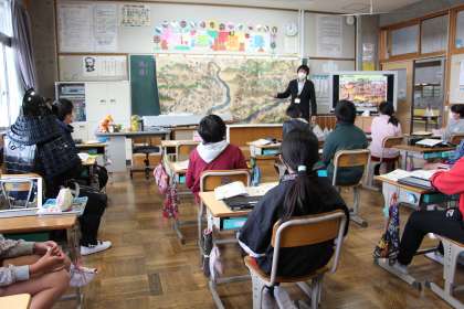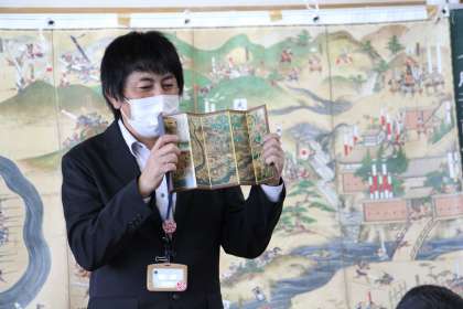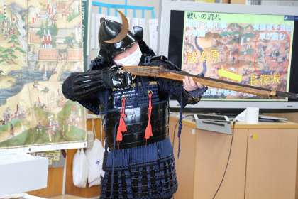 6年生郷土資料館出前授業 公開日 2021/10/25 更新日 2021/10/25 お知らせ 本日6年生を対象に、豊田市郷土資料館の出前授業がありました。 「長篠の戦」の学習でした。合戦図の屏風や火縄銃、甲冑など、当時の様子が分かるものをたくさん持って来てくれたため、様子がよくわかりました。 モデルとして甲冑を付けた児童は、その後の授業も装着したまま武士として(?)参加しました。