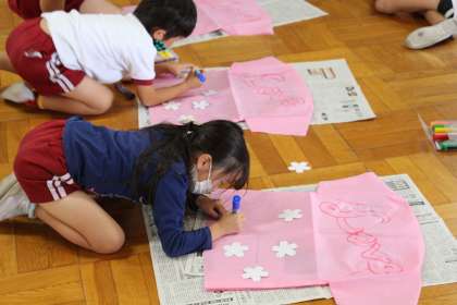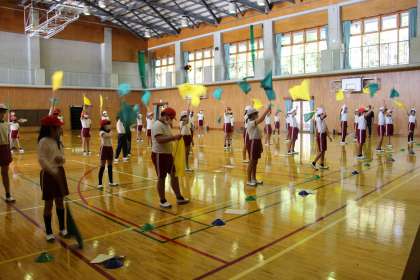 5・6年生は、旗体操の隊形移動の確認をしながら振付の練習をしました。先ほども紹介しましたが、1・2年生の衣装作りの続報です。愛らしいいいものができつつあります。