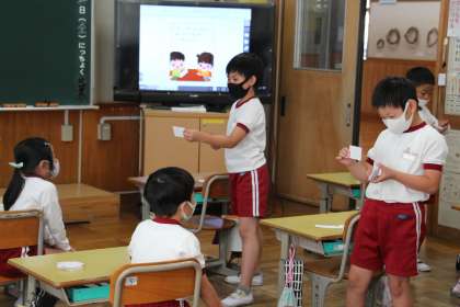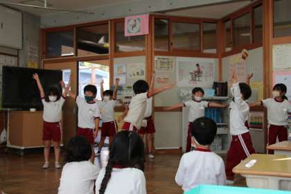 今日の様子(11/5) 公開日 2021/11/05 更新日 2021/11/05 お知らせ 今日の授業の様子です。1年生は、2年生に教えてもらったダンスの確認です。踊る人と見る人に分かれ、練習しました。 2年生は、九九の6の段でカードを使って答える練習でした。30秒間で、12枚という強者も出ました。3年生は英語の歌です。デジタル教科書の歌に負けない発音で歌えたでしょうか?