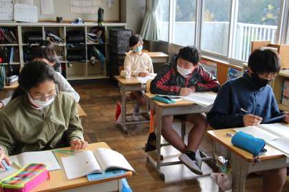 6年生の授業の様子です。社会では「5人組制度」を学びました。連帯責任の是非についても考えました。算数はグラフです。y=3×Xのグラフを書きました。「×」こそ入っていますが、中学校で学ぶ内容とほぼ同じです。