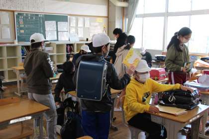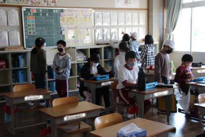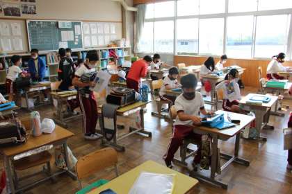 登校後の教室の様子です。子どもたちは、登校した後、荷物の片づけ等いろいろな活動をしています。教室にいない子は、水やりなどの係活動もしています。