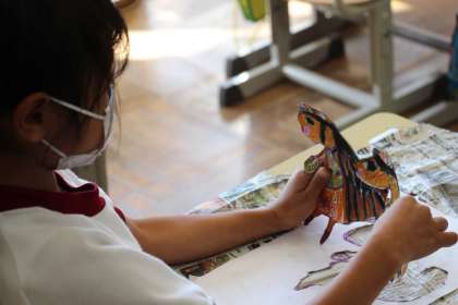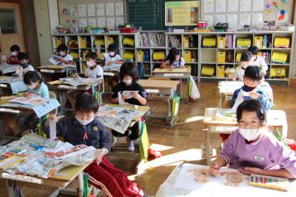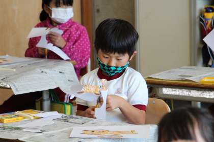 1年生図工 公開日 2021/11/17 更新日 2021/11/17 お知らせ 1年生の図工の授業「おはなしからうまれたよ」の様子です。お話からのキャラクターなど自分が描きたいものをていねいに切り取り、台紙にバランスよく貼っていました。