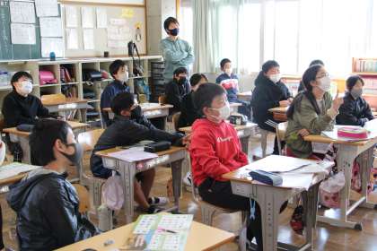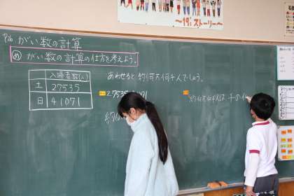 今日の様子2(11/19) 公開日 2021/11/19 更新日 2021/11/19 お知らせ 1・2枚目は、4年生の授業の様子です。算数の授業は「概数」でした。二つの考え方を黒板に書かせ、みんなで考えを深めました。音楽はリコーダー演奏でした。コロナが収まりつつあるので、練習することができるようになりました。 6年生は、英語で「We all live on the Earth.」の授業でした。授業中ALTは英語しか話さないので、英語で言われたことを聴いて理解し、真剣に取り組んでいます。