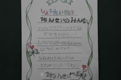 おもちゃワクワクワールド 公開日 2021/12/15 更新日 2021/12/15 お知らせ 本日、2年生が「おもちゃワクワクワールド」を主催し、1年生を招いて行われました。多くのブースに分かれ、楽しい遊びをともに楽しみました。 事前に、招待状をもらっていた1年生は、この日が来るのを心待ちにしていました。