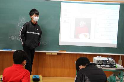 6年生の授業の様子です。1枚目は、あすくす学級恒例のスピーチです。写真と紹介したいものを画面に映し、スピーチを行います。今日は、「たこの入っていない、たこ焼き」を食べたお話でした。