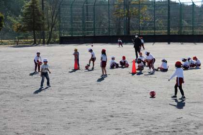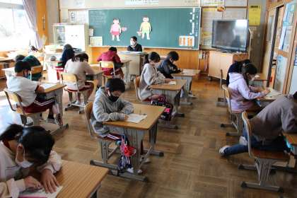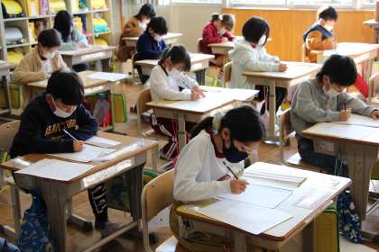 今日の授業の様子です。1年生の体育は、運動場で「ボールけり遊び」です。以前よりも足での扱いが上手になっていました。2枚目も1年生です。書写(書きかた)の様子です。いつもにも増して、慎重に集中して行っていました。
