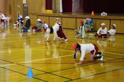 3年生の体育の授業の様子です。鉄棒の贈呈とともに、体力作りについて学んだことを生かし、マット運動につながる体力づくりを行いました。