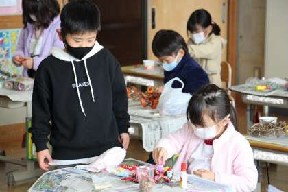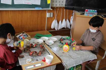 1年生のリースづくりの様子です。乾燥させたつるに様々な飾りをつけ、自分好みのリースが出来上がりました。