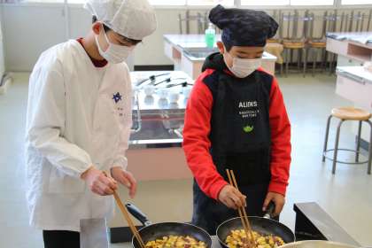 あすくす学級調理実習 公開日 2021/12/22 更新日 2021/12/22 お知らせ あすくす学級の調理実習の様子です。学校園で収穫したサツマイモを使って、調理実習を行いました。メニューは、みんな大好き「大学芋」です。とても美味しく出来上がりました。