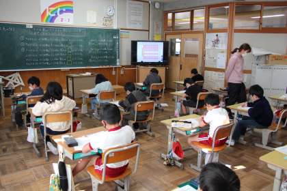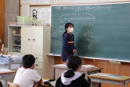 算数の授業 公開日 2022/01/11 更新日 2022/01/11 お知らせ 1月7日の記事になります。各学年の算数の授業の様子をお伝えします。 2年生は、九九のまとめの時期です。繰り上がりの法則性を考えました。4年生は割り算です。小数でかつ余りのある割り算です。ここが分かれば、割り算は大丈夫です。 5年生は、生活に生きる内容です。「%」について学びました。授業のめあても、生活に即したものとなっていました。