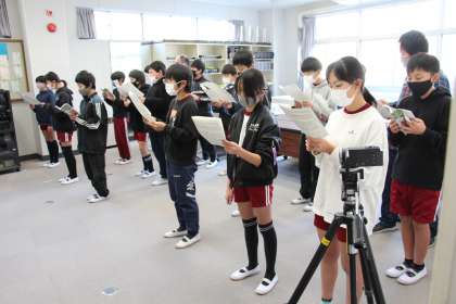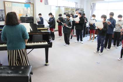 6年生合唱指導 公開日 2022/01/13 更新日 2022/01/13 お知らせ 昨日の記事になります。6年生の音楽では、卒業式に向けて合唱練習が始まりました。昨日は、講師の先生にお越しいただき、より専門的な指導をしていただきました。 このところ、コロナオミクロン株が猛威を振るっていますので、どこまでやれるかが未知数となりますが、しっかり感染対策を考え、準備だけは進めていきたいと思います。