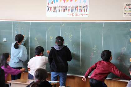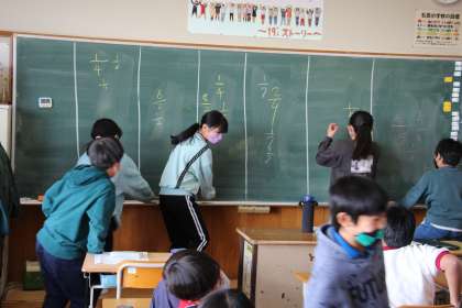 4年生算数 公開日 2022/01/21 更新日 2022/01/21 お知らせ 4年生では、算数に関わる楽しい活動をしていたので紹介します。 グループで協力して、少しでも早く、多く行動するというミッションです。黒板に各班ごとの場所を定め、制限時間内に「分数を書きなさい」→「1よりも大きい分数を書きなさい」とお題を変え、進めました。 子どもたちはルールを守り、リレー形式ですばやく回答しました。