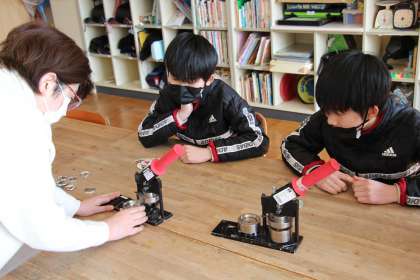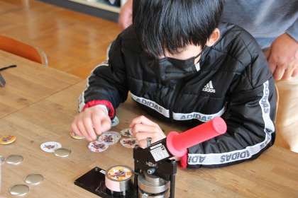 WE LOVE 石畳プロジェクト 公開日 2022/01/26 更新日 2022/01/26 お知らせ 「WE LOVE 石畳」プロジェクトとして、缶バッチづくりに取り組みました。まずは、缶バッチづくりの先駆者である「あすくす学級」からスタートです。 Mスペース夢現の山口社長に作り方を教わり、バッチづくりがスタートしました。1回作り方を聞いただけで、間違えることなくスムーズに作成することができました。