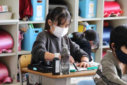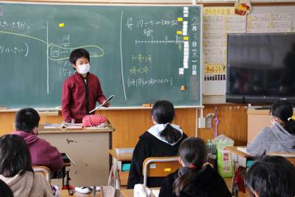 算数は、仮分数と帯分数で表された数のどちらが大きいかを求める問題です。分数を同じ条件にして比べるのですが、やり方は一つではないので友達の考えをしっかり聴いていました。