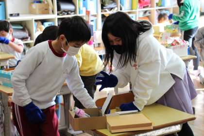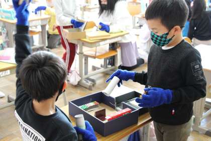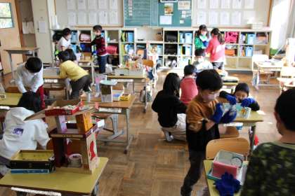 昨日の話題になります。2年生の図工「ともだちハウス」の作成後、ペアで遊んでいる場面です。