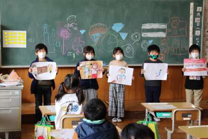 1年生の発表は「小学校のことを紹介しよう」です。絵や写真を使って、分かりやすく紹介しました。