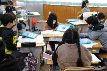 3年生の国語「外国のことを紹介しよう」のグループ発表の様子です。タブレットPCを使い、調べたことを発表し合いました。