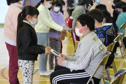 卒業を祝う会3 公開日 2022/03/04 更新日 2022/03/04 お知らせ 3年生の取組の様子です。3年生は、体を張ったゲームの対戦でした。この日のために準備をしてきた3年生が優勢でスタートしましたが、最終エンドで6年生が大逆転で勝利しました。 また、手作り写真立てをプレゼントしました。