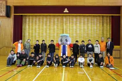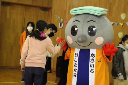 全校集会2 公開日 2022/03/07 更新日 2022/03/07 お知らせ お披露目の後は、来年度の石畳朝市についての案内がありました。来年から、開始時刻が10時になります。また、各月々にイベントがあるのでどんどん参加してください。本校の子どもたちも、参加できるように準備を進めていきます。 全校集会の退場時は、一人一人だたみんとハイタッチをしました。最後に、今日の主役のだたみんと6年生で記念撮影を行いました。