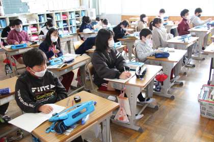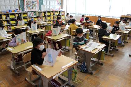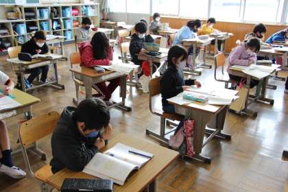 2年生は、算数の授業です。もうすぐ3年生の復習です。4年生は、社会です。各市町村の特徴的な建造物について学んでいます。