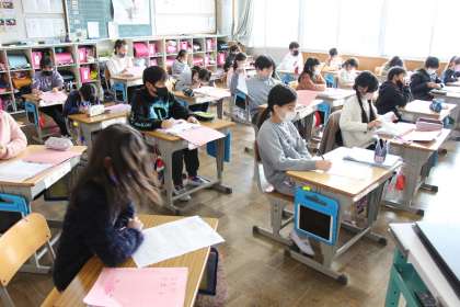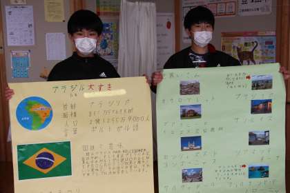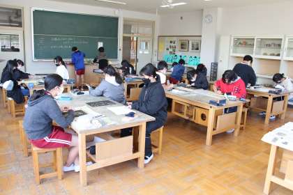 今日の様子2(3/7) 公開日 2022/03/07 更新日 2022/03/07 お知らせ 今日の授業の様子をお知らせします。あすなろ学級は、ブラジルのまとめが完成しました。4枚にわたるまとめのうち、2枚をもって記念撮影をしました。 3年生は、算数のテスト返しの場面です。今後の入試等も視野に入れ、消し忘れや字が読めないなど、あいまいな解答は「×」になることを教わりました。 5年生は図工の版画です。多くの子が印刷に取り掛かっていました。