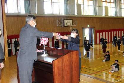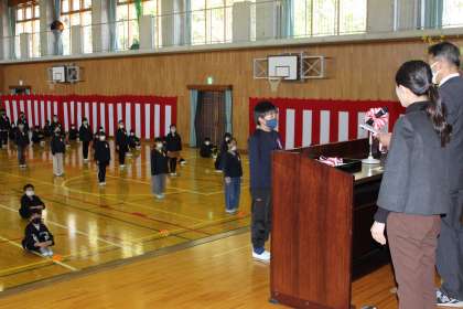 3〜5年生の代表に修了証を授与している様子です。全員が元気よく返事をすることができました。
