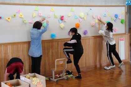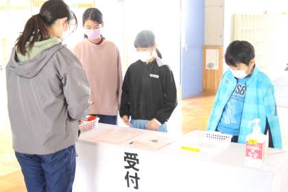 新入生受付と1階の廊下の準備、明日の動きの確認の様子です。