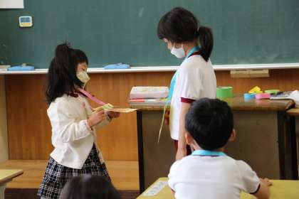 今日の1年生 公開日 2022/04/15 更新日 2022/04/15 お知らせ 今日の1年生の算数と算国語の授業の様子をお知らせします。 算数は、同じ仲間で分ける学習です。黒板やタブレットPC、電子黒板も使って行いました。 国語では、自分を紹介する勉強をしました。大きな紹介名札を首にかけ、出会った人とあいさつをする練習もしました。