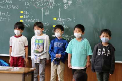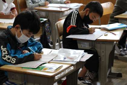 算数では、担任が机間指導しながら「〇付け」をしています。自信をもって発言できる手だての一つです。その間も、子どもたちが真剣に問題を解く姿が見られました。