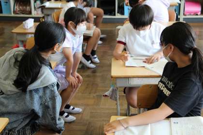 ペア・グループ学習 公開日 2022/05/25 更新日 2022/05/25 お知らせ 昨日の記事になりますが、5年生の国語のペア・グループ学習の様子をお知らせします。 学習において、自分の考えをもつことが一番ですが、それを理由や根拠をもって説明する(伝える)ことを大切にしています。今日紹介するのは、その後に意見交換をしてさらに深める段階です。