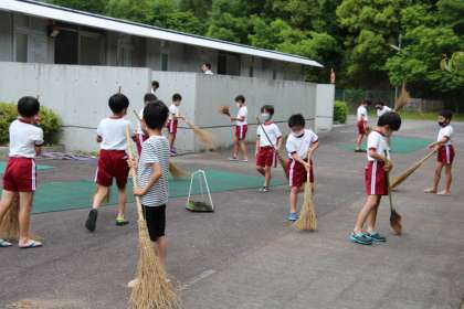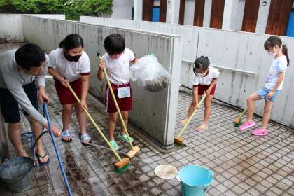 本日3年ぶりの水泳学習を控え、プールの清掃を行いました。3・4年生は、プール回りや更衣室等の清掃を担当しました。