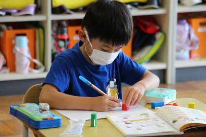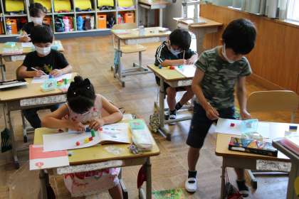 1年生の算数「いろいろなかたち」の授業の様子についてお知らせします。○や□、△の形を使って絵を描きました。自由な発想で、いろいろな形からできる絵を楽しみました。
